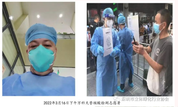 2022年3月15日,在接到龙岗区龙城街道的抗疫服务需求后,深圳市大业园林建设有限公司的总经理陈庆荣先生,毫不犹豫的组织动员公司员工参加抗疫志愿服务、支援第一轮全民核酸检测。一整天的防疫工作任务中,维持秩序、扫码登记、搬运物资、……面对每一项工作,陈庆荣先生都认真、耐心地完成。